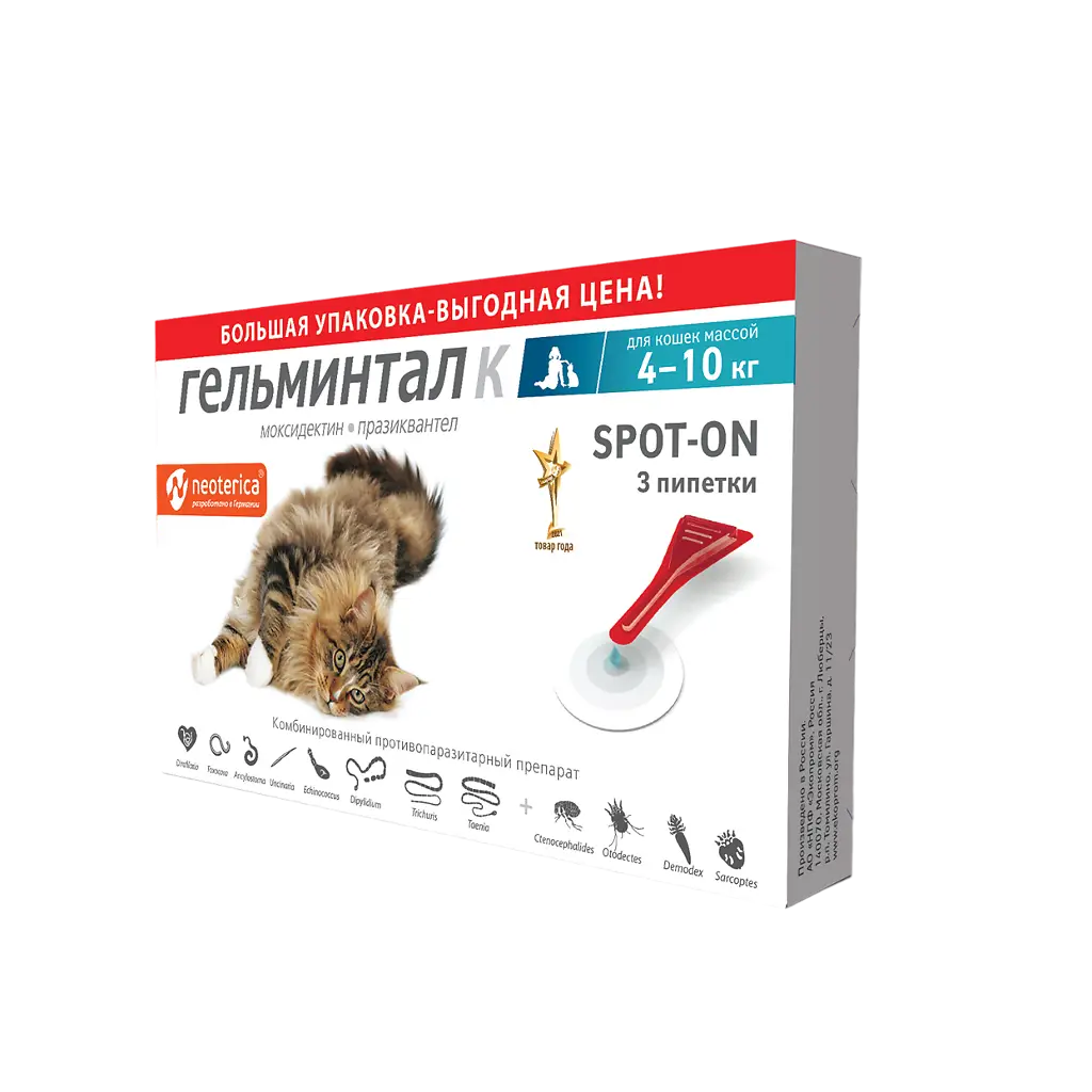 Гельминтал Spot-on для кошек - препарат широкого спектра действия. Давайте препарат однократно, как с профилактической, так и с лечебной целью. Капли действуют 1 месяц.