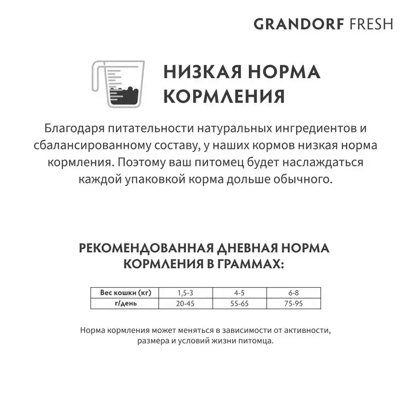 Без зерна и глютена. Благодаря беззерновому и безглютеновому составу корма Grandorf Fresh легко усваиваются и отлично подходят для животных с чувствительным пищеварением или пищевой аллергией.