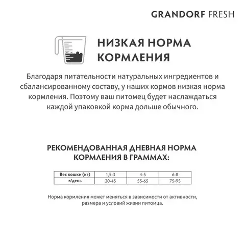 Без зерна и глютена. Благодаря беззерновому и безглютеновому составу корма Grandorf Fresh легко усваиваются и отлично подходят для животных с чувствительным пищеварением или пищевой аллергией.