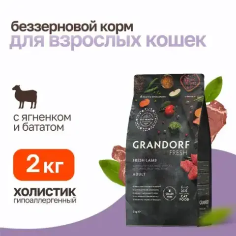 Без зерна и глютена Благодаря беззерновому и безглютеновому составу корма Grandorf Fresh легко усваиваются и отлично подходят для животных с чувствительным пищеварением или пищевой аллергией.