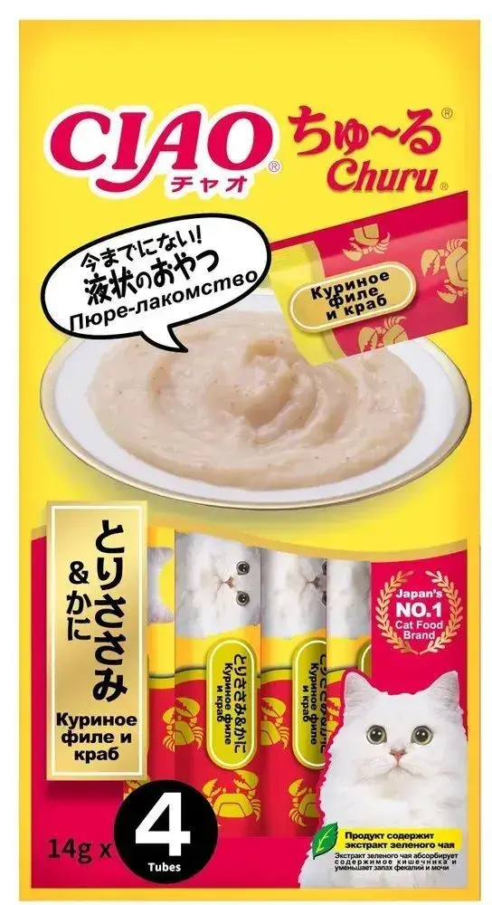 Суперпремиальное лакомство-пюре на основе нежного филе фермерской курицы с добавлением краба Ciao Churu от японского производителя Inaba изготовлено исключительно из натуральных ингредиентов и отличается высоким процентом влажности, благодаря чему поддерживается водный баланс организма кошки.