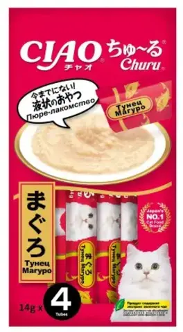 Суперпремиальное лакомство-пюре на основе мяса глубоководного тунца Ciao Churu от японского производителя Inaba изготовлено исключительно из натуральных ингредиентов и отличается высоким процентом влажности, благодаря чему поддерживается водный баланс организма кошки.