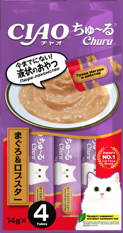 Суперпремиальное лакомство-пюре на основе мяса глубоководного тунца с добавлением лобстера Ciao Churu от японского производителя Inaba изготовлено исключительно из натуральных ингредиентов и отличается высоким процентом влажности, благодаря чему поддерживается водный баланс организма кошки.