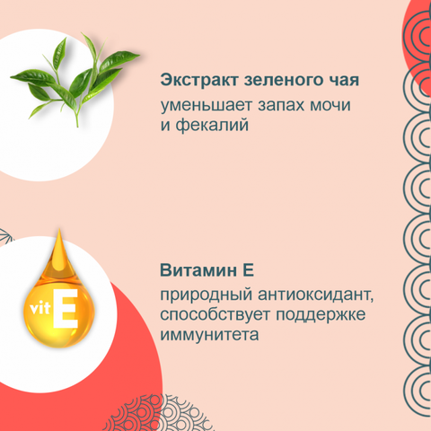 Во все продукты добавлен экстракт зеленого чая, который, благодаря содержанию катехина, обладает нейтрализующим действием на запах содержимого кишечника.
