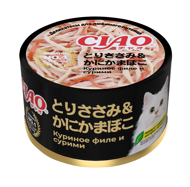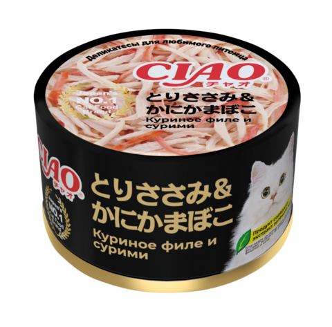 Супер-премиальный влажный корм для кошек CIAO can (ЧАО КЭН) от японского производителя Inaba приготовлен на основе кусочков филе фермерской курицы с добавлением сурими со вкусом краба.