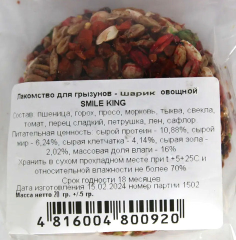 Натуральные лакомства для грызунов - Овощной шарик Smile King 25 г - это идеальное решение для ваших питомцев. Серия натуральных лакомств для грызунов - дает питомцу здоровое витаминизированное питание, а Вам - уверенность в надежности премиум продукта.