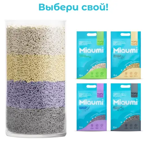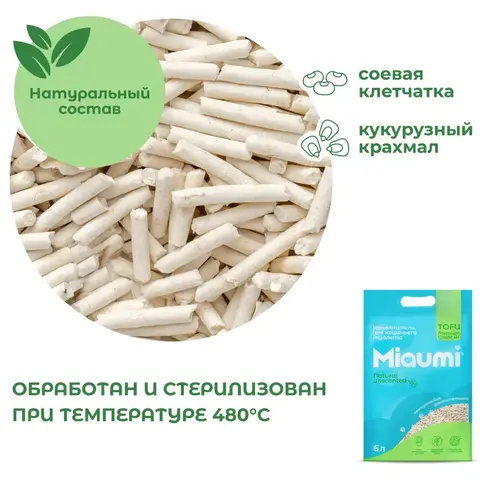 Miaumi TOFU Natural Unscented – натуральный наполнитель для кошачьего туалета из спрессованных соевых волокон без ароматизатора.