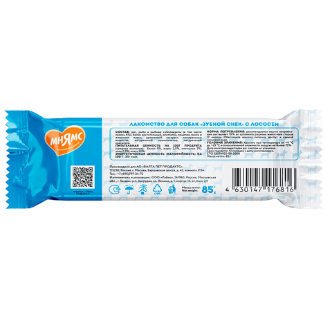 Мнямс DENTAL "Зубной снек"с лососем – вкусное и полезное лакомство для взрослых собак крупных пород и щенков крупных пород старше 3-х месяцев. Обладает высокой вкусовой привлекательностью и прекрасной поедаемостью. Благодаря особой форме гарантирует тщательное очищение даже самых труднодоступных мест полости рта, предотвращает появление налета и обеспечивает профилактику появления зубного камня, обладает антибактериальным и освежающим действием, деликатно массирует десны.