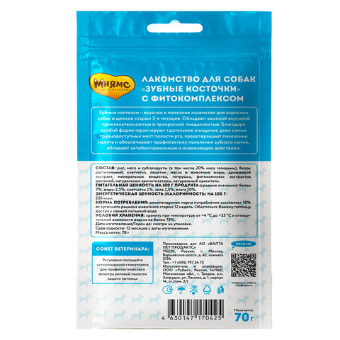 Мнямс DENTAL "Зубные косточки" – вкусное и полезное лакомство для взрослых собак и щенков старше 3-х месяцев. Обладают высокой вкусовой привлекательностью и прекрасной поедаемостью. Благодаря особой форме гарантируют тщательное очищение даже самых труднодоступных мест полости рта, предотвращают появление налета и обеспечивают профилактику появления зубного камня, обладают антибактериальным и освежающим действием.