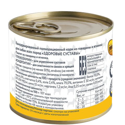 Состав: говядина (не менее 50%), ягнёнок (не менее 15%), глюкозамин, хондроитин, витамины и минералы.