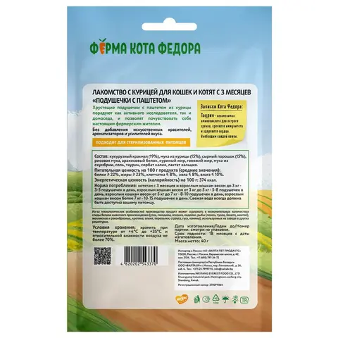 Хрустящие подушечки "Ферма кота Федора" с паштетом из курицы порадуют как активного исследователя, так и домоседа, и позволят почувствовать себя настоящим фермерским жителем. Натуральные ингредиенты с оптимальным количеством витаминов и минералов точно придутся по вкусу вашему питомцу. Без добавления исскуственных красителей, ароматизаторов и усилителей вкуса.