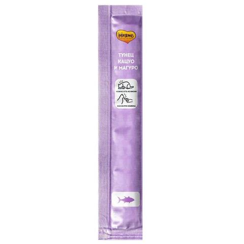 Состав: тунец Магуро (15%), тунец Кацуо (10%), экстракт тунца, гидролизованный белок рыбы, олигосахариды, масло растительное, крахмал, соль, желирующий агент, аминокислоты, витамин Е, натуральный краситель, бета-каротин.