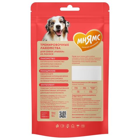 Мнямс тренировочные лакомства "Рыбки" из лосося для взрослых собак и щенков старше 3-х месяцев предназначены для поощрения питомца во время прогулки и дрессировки. Благодаря высокой вкусовой привлекательности, низкой калорийности и оптимальному размеру каждого лакомства идеальны для собак любых пород. Не пачкают руки и не крошатся, подходят для использования в интерактивных игрушках.