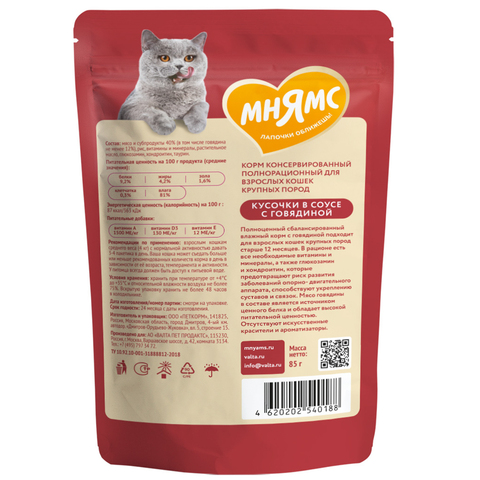 Высококачественный полнорационный сбалансированный влажный корм с говядиной подходит для взрослых кошек крупных пород старше 12 месяцев.
