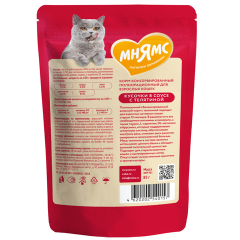 Высококачественный полнорационный сбалансированный влажный корм с телятиной подходит для взрослых кошек старше 12 месяцев.