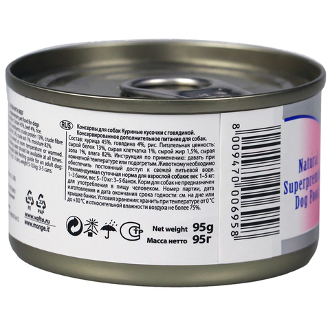 Влажный корм Monge Dog Natural для собак куриные кусочки с говядиной, консервы 95 г.