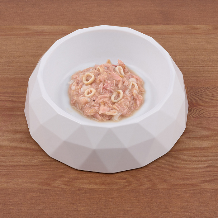 Тунец (Katsuwonus pelamis) 50%, кальмары (Loligo vulgaris) 5%, рис, тапиока, фруктоолигосахариды (F.O.S.) 0,04%.