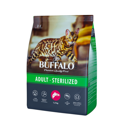 Полнорационный сухой корм Mr. Buffalo с лососем для взрослых стерилизованных кошек и кастрированных котов. Разработан с учётом потребностей стерилизованных кошек и кастрированных котов, включает все необходимые питательные вещества для поддержания жизненных сил и здоровья питомца. Благодаря умеренному содержанию жиров корм помогает снизить риск возникновения избыточного веса при соблюдении норм кормления.