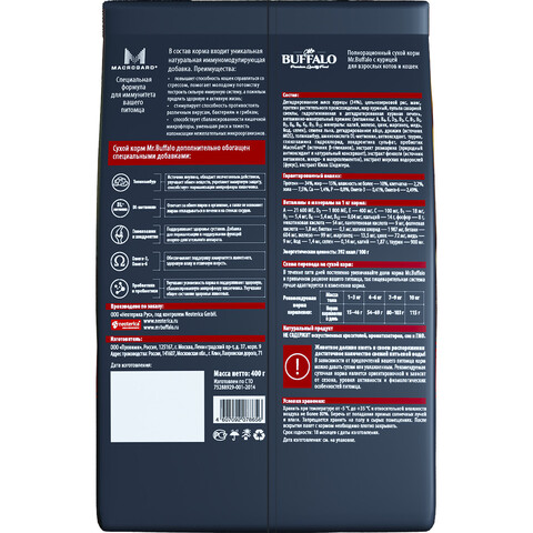 Полнорационный сухой корм Mr. Buffalo для взрослых кошек с курицей включает все необходимые питательные вещества для поддержания жизненных сил и здоровья вашего питомца. Корм содержит уникальную добавку MacroGard (МакроГард), которая повышает способность кошек справляться со стрессом, стимулирует способность противостоять вирусам, бактериям и грибкам, способствует сбалансированности кишечной микрофлоры.