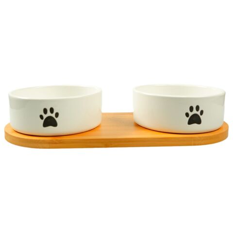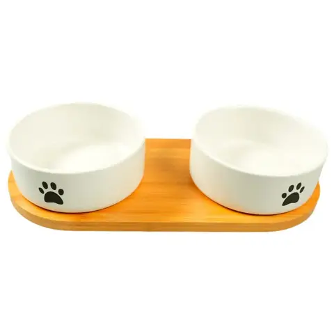 Mr.Kranch миска керамическая белая двойная на бамбуковой подставкMr.Kranch миска на подстае 2х350 мл