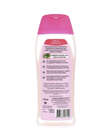Специально разработанный шампунь на основе натуральных ингредиентов для чувствительной кожи собак. Мягкая формула шампуня бережно и нежно очищает кожу и шерсть от загрязнений, не вызывает аллергических реакций. Натуральный кондиционер хитозан и Алое Вера увлажняют, питают и восстанавливают шерсть, способствуют легкому расчесыванию.