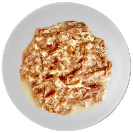 Ингредиенты: Белое мясо тунца 27,86%, курица 27,86%, соус 44,28% (вода, крахмал тапиоки, гуаровая камедь, витамин Е)