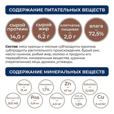 мясо и мясные субпродукты курицы, субпродукты растительного происхождения, рисовая мука, масло льняное, рыбий жир, молоко и продукты его переработки, минеральные вещества, куриные (перепелиные) яйца, дрожжи, углеводы. Аналитические свойства: Cырой протеин - 10 г, сырой жир - 6,2 г, минеральные вещества 1,7%, клетчатка пищевая 2%, влага - 80,0%. Усвояемая энергия (собака) - 1160 ккал/кг. Усвояемая энергия (кошка) – 1200 ккал/кг, основные жирные кислоты 1,8%, EPA/DHA 0,45%, медь 5 мг/кг. Энергетическая ценность на 100 г продукта – 95,8 ккал..