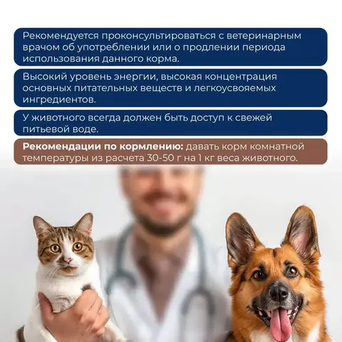 Влажный корм Recovery от Original Choice предназначен для животных в диетическом, восстановительном и послеоперационном периодах. Это супер-премиум класс корма, который содержит ингредиенты высокого качества, поддерживающие здоровье и благополучие вашего питомца. Основной вкус корма – птица, что делает его особенно привлекательным для кошек и собак. Состав корма включает масло, обеспечивая необходимые жирные кислоты для поддержания здоровья шерсти и кожи. Этот корм является идеальным выбором для тех, кто стремится обеспечить своему питомцу высококачественное питание в периоды восстановления после операций или при необходимости диетического питания. Показатели: сырой протеин - 10 г, сырой жир - 6,2 г, минеральные вещества 1,7%, клетчатка пищевая 2%, влага - 80,0%. Усвояемая энергия (собака) - 1160 ккал/кг. Усвояемая энергия (кошка) – 1200 ккал/кг, основные жирные кислоты 1,8%, EPA/DHA 0,45%, медь 5 мг/кг. Энергетическая ценность на 100 г продукта – 95,8 ккал.