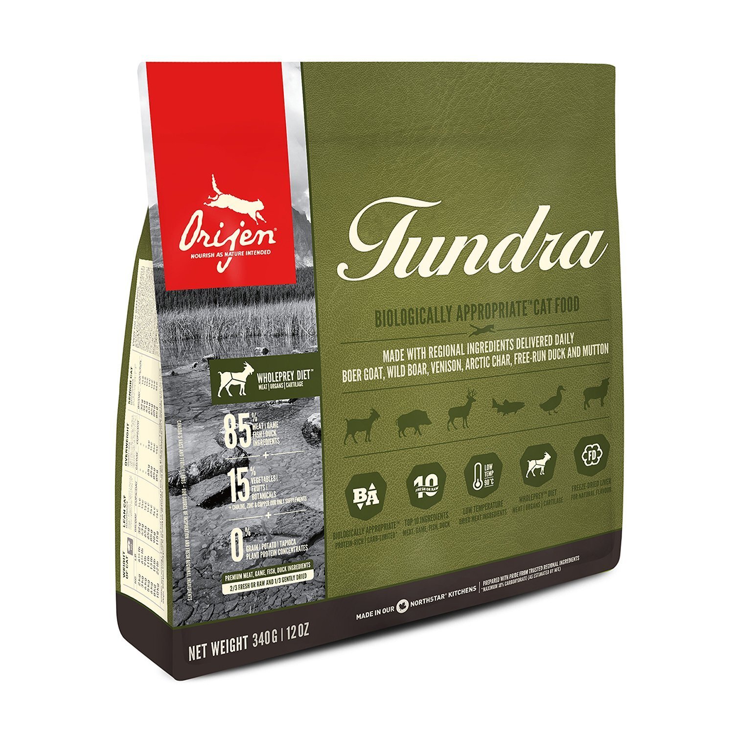 Ингредиенты Свежее мясо козы (5%), свежее мясо кабана (5%), свежее мясо оленя (5%), свежий арктический голец (5%), свежее мясо утки (5%), свежая баранина (4%), свежая радужная форель (4%), свежая печень утки (4%), свежая печень кабана (4%), свежие почки кабана (4%), цельная скумбрия дегидратированная (4%), свежая цельная сардина (4%), ягнятина дегидратированная (4%), баранина дегидратированная (4%), треска дегидратированная (4%), цельная путассу дегидратированная (4%), утиный жир (4%), цельная сельдь дегидратированная (4%), цельная красная чечевица, цельная зеленая чечевица, цельный зеленый горошек, цельный нут, цельный желтый горошек, цельная фасоль, клетчатка из чечевицы, свежий бараний рубец (1,5%), масло сельди (1%), свежее козье сердце (1%), свежие козьи почки (1%), свежая печень козы (0,5%), свежее оленье сердце (0,5%), свежая печень оленя (0,5%), свежая баранья печень (0,5%), свежее сердце кабана (0,5%), цельные бобы, печень козы сублимированная, печень оленя сублимированная, свежая цельная столовая тыква, свежая цельная мускатная тыква, свежий цельный цукини, свежий цельный пастернак, свежая морковь, свежие яблоки «Ред Делишес», свежие цельные груши «Бартлетт», свежая листовая капуста, свежая зелень шпината, свежие листья свеклы, свежая зелень репы, бурые водоросли, цельная клюква, свежая черника, корень цикория, куркума, корень сарсапарели, корень алтея, шиповник, ягоды можжевельника. Добавки Холина хлорид 1200 мг, хелат цинка 100 мг, хелат меди 11 мг, сухой продукт ферментации Enterococcus faecium. Калорийность 4120 ккал/кг (535 ккал на стакан объёмом 250 мл/120 г), при этом 39% калорий организм получает из белка, 17% — из фруктов и овощей и 44% — из жира.