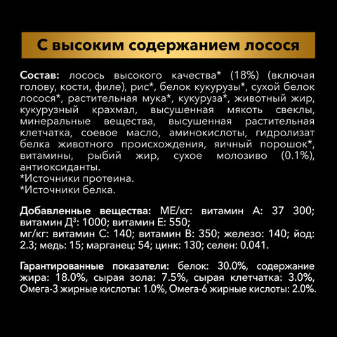 лосось высокого качества* (18%) (включая голову, кости, филе), рис*, белок кукурузы*, сухой белок лосося*, растительная мука*, кукуруза*, животный жир, кукурузный крахмал, высушенная мякоть свеклы, минеральные вещества, высушенная растительная клетчатка, соевое масло, аминокислоты, гидролизат белка животного происхождения, яичный порошок*, витамины, рыбий жир, сухое молозиво (0.1%), антиоксиданты. *Источники белка.