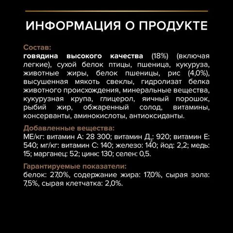 Говядина высокого качества (18%) (включая легкие), сухой белок птицы, пшеница, кукуруза, животные жиры, белок пшеницы, рис (4,0%), высушенная мякоть свеклы, гидролизат белка животного происхождения, минеральные вещества, кукурузная крупа, глицерол, яичный порошок, рыбий жир, обжаренный солод, витамины, консерванты, аминокислоты, антиоксиданты.