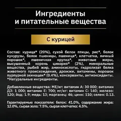 Курица* (20%), сухой белок птицы, рис*, белок кукурузы, белок пшеницы, пшеница*, клетчатка, яичный порошок*, пшеничная крупка*, животные жиры, высушенный корень цикория* (2%), минеральные вещества, рыбий жир, аминокислоты, гидролизат белка животного происхождения, дрожжи, витамины, порошок пурпурной эхинацеи* (0.4%), консерванты, антиоксиданты.
