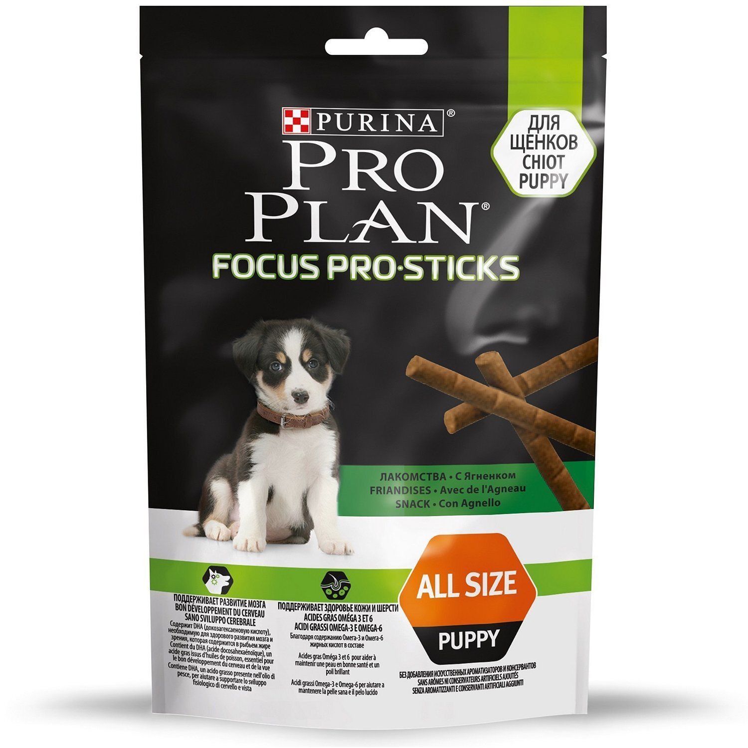 Команда квалифицированных ветеринаров и диетологов разработала лакомство Focus PRO Stick для щенков, которое способствует здоровому развитию мозга и зрения. С Purina Pro Plan Focus PRO Stick дрессировка будет приятнее — лакомство помогает сохранять интерес собаки во время тренировки и является полезным поощрением. Содержит незаменимую Омега-3 жирную кислоту DHA из рыбьего жира, которая поддерживает здоровье мозга и зрения на ранних этапах развития. Можно давать целиком или по кусочкам. Не содержит искусственных красителей, ароматизаторов и консервантов. Преимущества: ПОДДЕРЖИВАЕТ РАЗВИТИЕ МОЗГА Содержит DHA (докозагексаеновую кислоту), необходимую для здорового развития мозга и зрения, которая содержится в рыбьем жире Белок высокого качества Омега-3 и Омега-6 жирные кислоты в составе помогают поддерживать здоровье кожи и шерсти Без добавления искусственных ароматизаторов и консервантов Без добавления красителей Витамины и антиоксиданты помогают поддерживать иммунитет Рекомендации по кормлению: Можно давать целиком или по кусочкам. Идеально для поощрения во время дрессировки. Рекомендации по кормлению (шт./день): Пожалуйста, скорректируйте суточную норму основного корма в соответствии с нормой лакомства в день. Следите, чтобы у собаки всегда была чистая, свежая питьевая вода. Присутствуйте рядом с Вашим питомцем во время кормления вкусным лакомством. Для щенков старше 6 месяцев. Вес одной палочки: приблизительно 8 г. Состав: пшеница, пшеничный глютен, сухой белок птицы, глицерол, сухой белок ягненка (4%), сорбитол, пшеничная мука, минеральные вещества, рыбий жир (1%), птичий жир, консерванты, моноглицериды из растительных масел, витамины, антиоксиданты. Гарантированные показатели: белок: 32.8%, содержание жира: 6.9%, сырая зола: 5.8%, сырая клетчатка: 0,76%, влажность: 18.0%, Омега-3 жирные кислоты: 0,36%, докозагексаеновая кислота: 0,08%, Омега-6 жирные кислоты: 1,6%. Добавленные вещества: МЕ/кг: витамин А: 15000; витамин Д3: 876; мг/кг: железо: 65.2; йод: 1.6; медь: 7.3; марганец: 6.0; цинк: 97.8; селен: 0.15.
