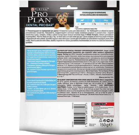 Лакомство PRO PLAN Dental Pro Bar разработано ветеринарными врачами для поддержания здоровья полости рта вашей собаки. Помогает зубам и костям оставаться крепкими благодаря сбалансированному содержанию минералов. Поддерживает правильное пищеварение благодаря рису — основному источнику углеводов. Способствует снижению образования зубного камня на 43% благодаря механическому эффекту пережевывания Мягко массирует десны благодаря эластичной структуре и успокаивающему эффекту гвоздики Помогает зубам и костям оставаться крепкими благодаря сбалансированному содержанию минералов Без добавления искусственных красителей, искусственных ароматизаторов Состав: Рис (50%), глицерин, сухой белок птицы, минеральные вещества, пшеница, сорбит, вкусоароматическая кормовая добавка, моно- и диглицериды жирных кислот, молотая гвоздика (0,2%), бентонит, консерванты, антиоксиданты.