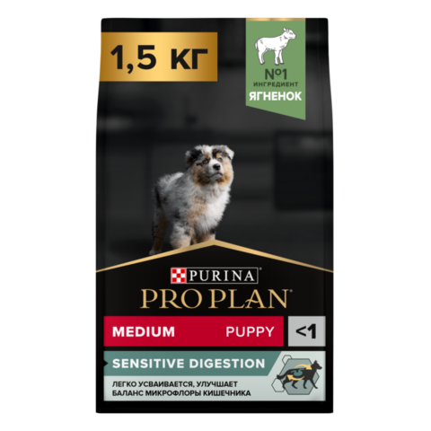 PRO PLAN Sensitive Digestion OPTIDIGEST Puppy Medium - Правильное функционирование пищеварительной системы имеет важное значение для получения питательных веществ, необходимых вашему щенку для развития и роста. Разработанный нашими ветеринарами и диетологами корм Purina® PRO PLAN® с комплексом OPTIDIGEST® повышает здоровье пищеварительной системы щенков, испытывающих дискомфорт в желудочно-кишечном тракте. Клинически доказано: OPTIDIGEST® содержит отобранный источник пребиотиков для улучшения баланса микрофлоры кишечника и качества стула. Преимущества 1)Корм легко переваривается и поэтому подходит собакам с чувствительным пищеварением 2)Пребиотики активно способствуют здоровью кишечника 3)Клинически подтверждено: улучшает баланс микрофлоры кишечника 4)Клинически подтверждено: улучшает баланс микрофлоры кишечника 5)В состав корма входит специальный компонент для укрепления иммунитета и здоровья на долгие годы Рекомендации по кормлению С 3 по 6 неделю начинайте давать размоченный корм Pro Plan® 3–4 раза в день. После полного прекращения кормления материнским молоком кормите согласно таблице. По достижении трехмесячного возраста постепенно снижайте количество воды, добавляемой для размачивания корма. Поддержание оптимальной массы тела очень важно для здоровья вашего щенка. Рекомендуемая суточная норма может варьироваться в зависимости от уровня активности, физических особенностей и индивидуальных потребностей вашего щенка. Следите, чтобы у собаки всегда была чистая, свежая питьевая вода. Для контроля здоровья вашей собаки обращайтесь в ветеринарную клинику на регулярной основе.