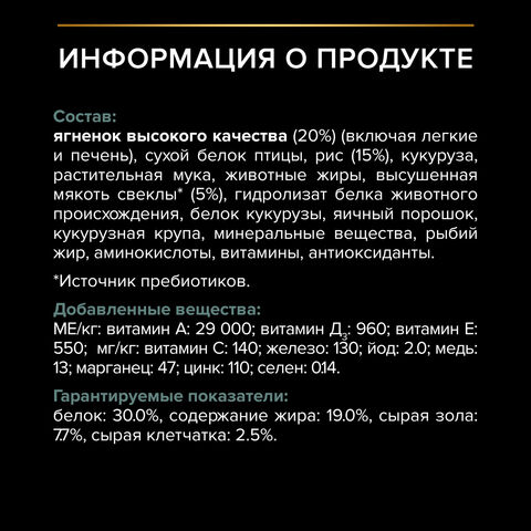 Ягненок высокого качества (20%) (включая легкие и печень), сухой белок птицы, рис (15%), кукуруза, растительная мука, животные жиры, высушенная мякоть свеклы* (5%), гидролизат белка животного происхождения, белок кукурузы, яичный порошок, кукурузная крупа, минеральные вещества, рыбий жир, аминокислоты, витамины, антиоксиданты. *Источник пребиотиков.