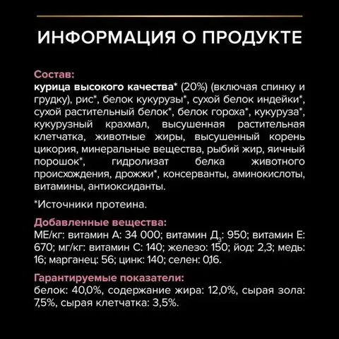 Курица высокого качества* (20%) (включая спинку и грудку), рис*, белок кукурузы*, сухой белок индейки*, сухой растительный белок*, белок гороха*, кукуруза*, кукурузный крахмал, высушенная растительная клетчатка, животные жиры, высушенный корень цикория, минеральные вещества, рыбий жир, яичный порошок*, гидролизат белка животного происхождения, дрожжи*, консерванты, аминокислоты, витамины, антиоксиданты.