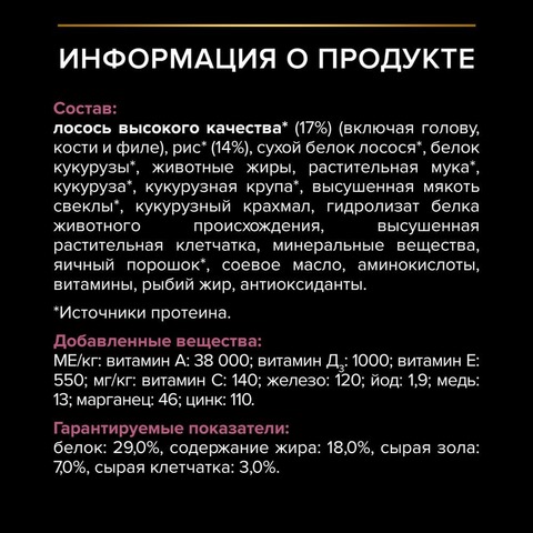 лосось* (17%), рис* (14%), сухой белок лосося*, кукурузный глютен*, животный жир, кукуруза*, продукты переработки растительного сырья*, кукурузная крупа*, сухая мякоть свеклы*, кукурузный крахмал, вкусоароматическая кормовая добавка, целлюлоза, минеральные вещества, яичный порошок*, соевое масло, витамины, рыбий жир, антиоксиданты (токоферолы природного происхождения)