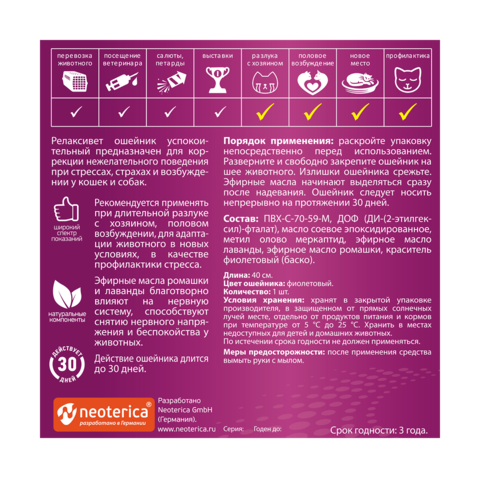 Успокоительный ошейник Relaxivet благотворно влияет на нервную систему, способствует снятию нервного напряжения и беспокойства у животных, особенно при адаптации к новым условиям и половом возбуждении.