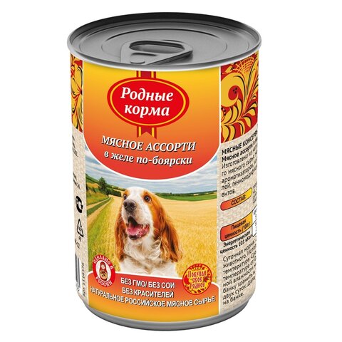 Консервы для собак Мясное ассорти в желе по-боярски ТУ 9216-008-00422646-12 Состав: говядина, мясо птицы (не менее 10%), баранина (не менее 5%), субпродукты мясные, желирующая добавка, растительное масло, соль, вода. Пищевая ценность 100?г. продукта: сырой протеин, не менее - 9,0 г; сырой жир, не более -7,0 г; сырая зола, не более - 2,0 г; клетчатка 1,0 г; влага, не более - 82,0% Энергетическая ценность 100?г. продукта - 101,0 ккал. Масса нетто: 410 г. Срок годности – не более 3 лет со дня изготовления. Дата изготовления указана на банке. Условия хранения: при температуре от 0С до 25С и относительной влажности воздуха не более 75%. Рекомендуется употреблять при комнатной температуре. После вскрытия потребительской упаковки продукт хранить в холодильнике не более 2 суток. Суточная норма 25 - 35?г. на 1 кг. веса животного. Знак обращения на рынке - РСТ. Информация с сайта производителя.