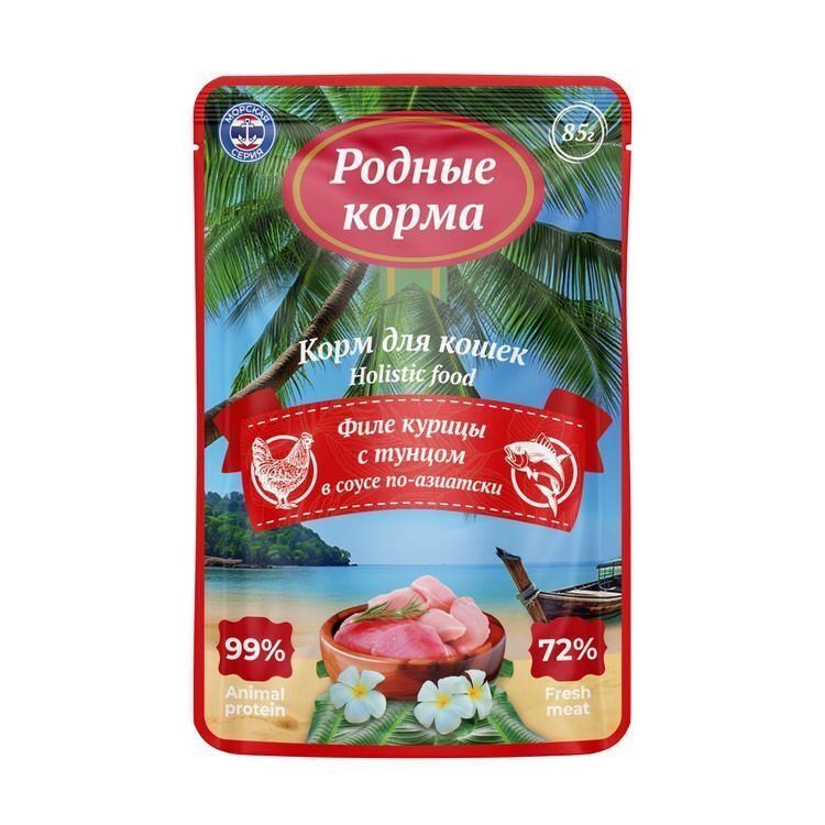 РОДНЫЕ КОРМА МОРСКАЯ СЕРИЯ – линейка российских кормов самого высочайшего и исключительного качества. При производстве применяется специальная технология, которая позволяет сохранить волокнистую структуру мяса. Откройте для своей кошки мир морских деликатесов с влажным кормом Родные корма «Морская серия» филе курицы с тунцом в соусе по-азиатски! Натуральный корм для кошек с филе курицы и тунцом в соусе подарит незабываемое вкусовое путешествие. Нежное куриное филе и ароматный тунец порадуют Вашего любимца и обеспечат его организм полезными веществами. Влажный корм Родные корма «Морская серия» содержит только натуральные ингредиенты, без искусственных красителей и ароматизаторов. Он легко усваивается и помогает поддерживать здоровье Вашей кошки. Не упустите возможность порадовать свою кошку этим вкусным и полезным лакомством!