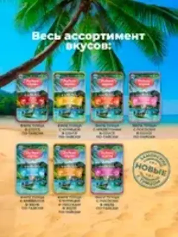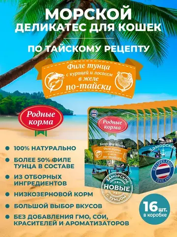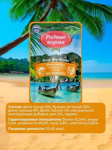Влажный корм для кошек паучи "Заморские"— это нежные кусочки филе тунца, курицы и лосося в аппетитном желе, приготовленные по традиционному тайскому рецепту. Ваш кот будет в восторге от этого неповторимого сочетания вкусов и ароматов!