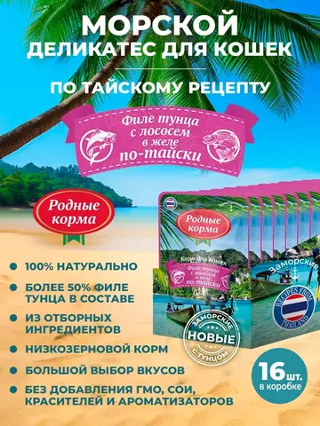 Родные Корма заморские паучи для кошек филе тунца с лососем в желе по-тайски 70 г