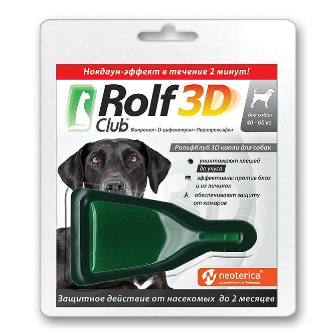 Рекомендации по применению РольфКлуб 3D капли для собак применяют собакам однократно путем точечного («spot on») нанесения на кожу. Кончик тюбик-пипетки предварительно отрезают ножницами. Лекарственный препарат, раздвинув шерсть, наносят на сухую неповрежденную кожу в области шеи у основания черепа или между лопатками (в места, недоступные для слизывания животным). В случае наличия присосавшихся клещей и паразитирующих насекомых, открепление и гибель их наступает в течение 1-2 часа после обработки. Продолжительность защитного действия от иксодовых клещей после однократной обработки сохраняется в течение 30 дней, против насекомых – до 2-х месяцев, репеллентное действие против летающих кровососущих насекомых – в течение 7 суток. Описание 1. Нокдаун-эффект в течение 2 минут: паралитическое действие препарата не позволяет клещу передвигаться по животному и выбирать место для укуса. 2. Защита от 10 видов наружных паразитов: иксодовых, отодектозных, саркоптозных, демодекозных клещей, блох (на всех фазах развития), вшей, власоедов, а также комаров, мошек и москитов. 3. Безопасность для животных: действующие вещества относятся к IV классу опасности и не всасываются в системный кровоток. 4. Эффективность: у паразитов не возникает привыкания к трехкомпонентной формуле.