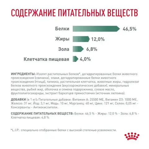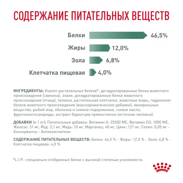 Ингредиенты: изолят растительных белков*, дегидратированные белки животного происхождения, злаки, тапиока, растительная клетчатка, животные жиры, гидролизат белков животного происхождения (вкусоароматические добавки), минеральные вещества, рыбий жир, оболочка семян подорожника, соевое масло, аминокислоты, фруктоолигосахариды, экстракт бархатцев прямостоячих (источник лютеина). *L.I.P.: специально отобранные белки с высокой степенью усвояемости.