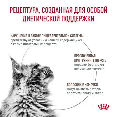 Сухой корм ROYAL CANIN GASTROINTESTINAL HAIRBALL (ГАСТРОИНТЕСТИНАЛ ГАСТРОИНТЕСТИНАЛ ХЭЙРБОЛЛ) - полнорационный диетический корм для взрослых кошек для выведения и профилактики образования волосяных комочков. Способствует выведению проглоченной шерсти и профилактике образования волосяных комочков , помогает поддерживать здоровое пищеварение и оптимальное качество стула. Умеренное содержание энергии в диете помогает контролировать массу тела