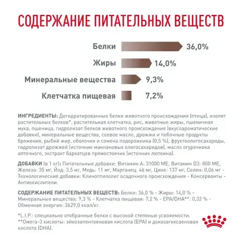 Ингредиенты: дегидратированные белки животного происхождения (птица), изолят растительных белков*, растительная клетчатка, рис, животные жиры, пшеничная мука, пшеница, гидролизат белков животного происхождения (вкусоароматические добавки), минеральные вещества, соевое масло, дрожжи и побочные продукты брожения, рыбий жир, оболочка семян подрожника (0,5 %), фруктоолигосахариды, гидролизат дрожжей (источник мaннановых олигосахаридов), масло огуречника аптечного, экстракт бархатцев прямостоячих (источник лютеина). *L.I.P.: специально отобранные белки с высокой степенью усвояемости.