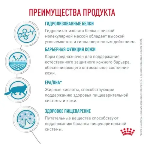 Сухой корм ROYAL CANIN® HYPOALLERGENIC (Гипоаллердженик ДР 25 (фелин))— полнорационный диетический корм для кошек, применяемый при пищевой аллергии или пищевой непереносимости некоторых ингредиентов. Специально отобранные источники белков и углеводов. РЕКОМЕНДАЦИИ: Посоветуйтесь с вашим ветеринарным врачом по поводу целесообразности использования данного корма. Курс применения сухого корма HYPOALLERGENIC — 3–8 недель. Если симптомы непереносимости исчезают, можно употреблять этот корм в течение всей жизни животного.