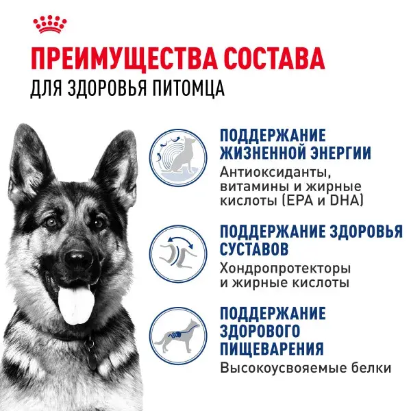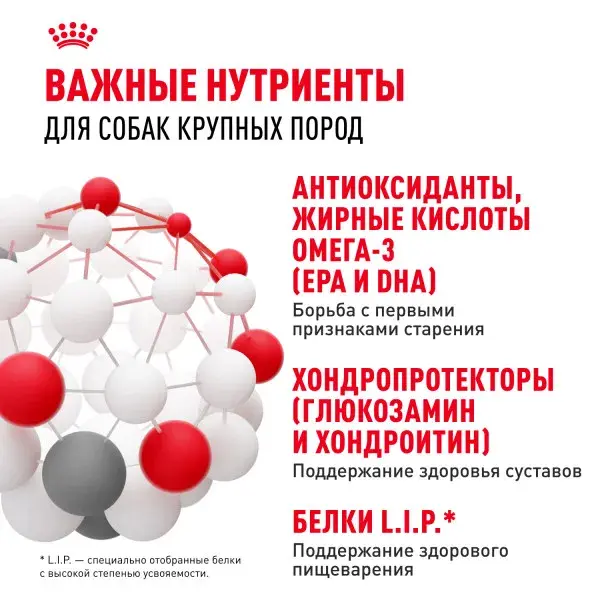 Специально подобранный комплекс питательных веществ замедляет процессы старения у пожилых собак крупных пород. Корм содержит жирные кислоты EPA-DHA и особый комплекс антиоксидантов для нейтрализации свободных радикалов.