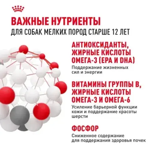 Жирные кислоты EPA-DHA, а также комплекс антиоксидантов помогают нейтрализовать свободные радикалы, что помогает поддерживать здоровье собак мелких размеров старше 12 лет.